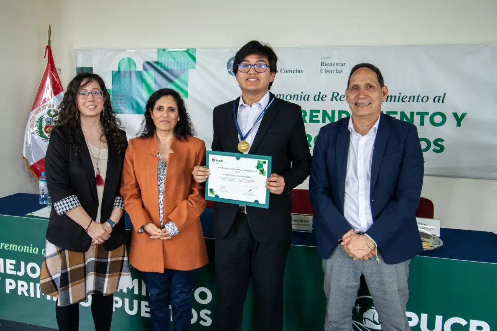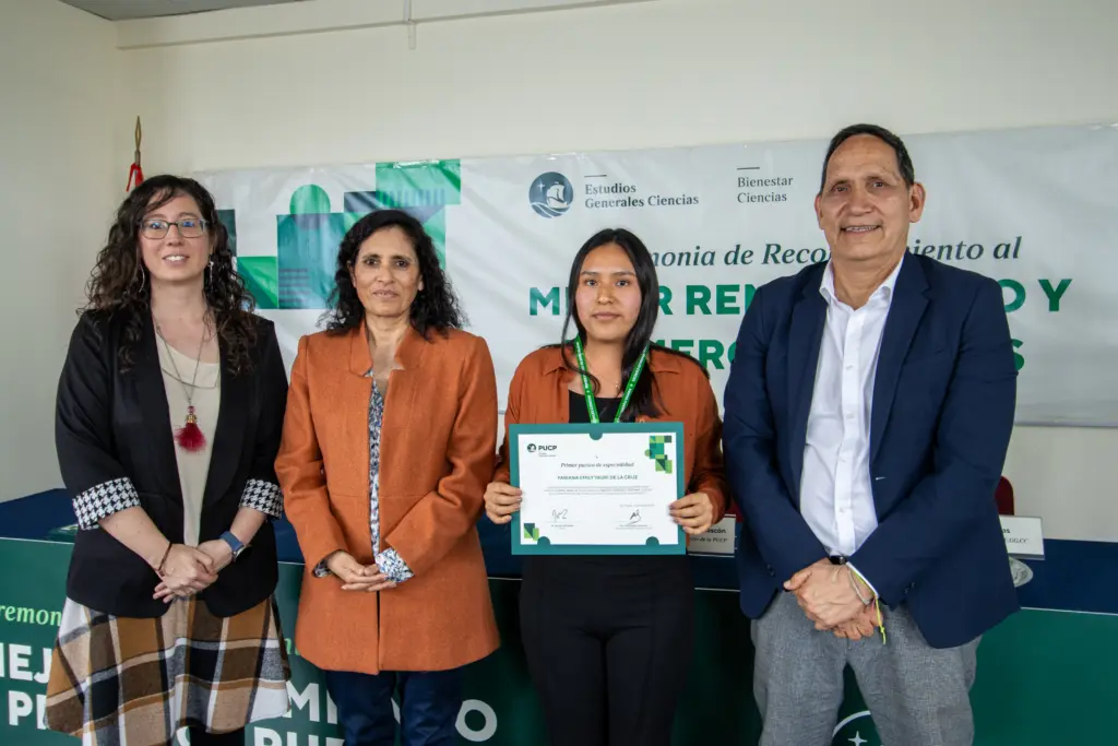 La Ceremonia de Reconocimiento al mejor rendimiento y primeros puestos 2025-1 fue presidida por la directora de estudios de EE.GG.CC., Ing. Gabriela Gómez Ríos; el secretario académico de EE.GG.CC., Ing. Darío Limo Rojas, y la coordinadora de la Oficina de Bienestar Ciencias, la Dra. Yulán Hernández García.